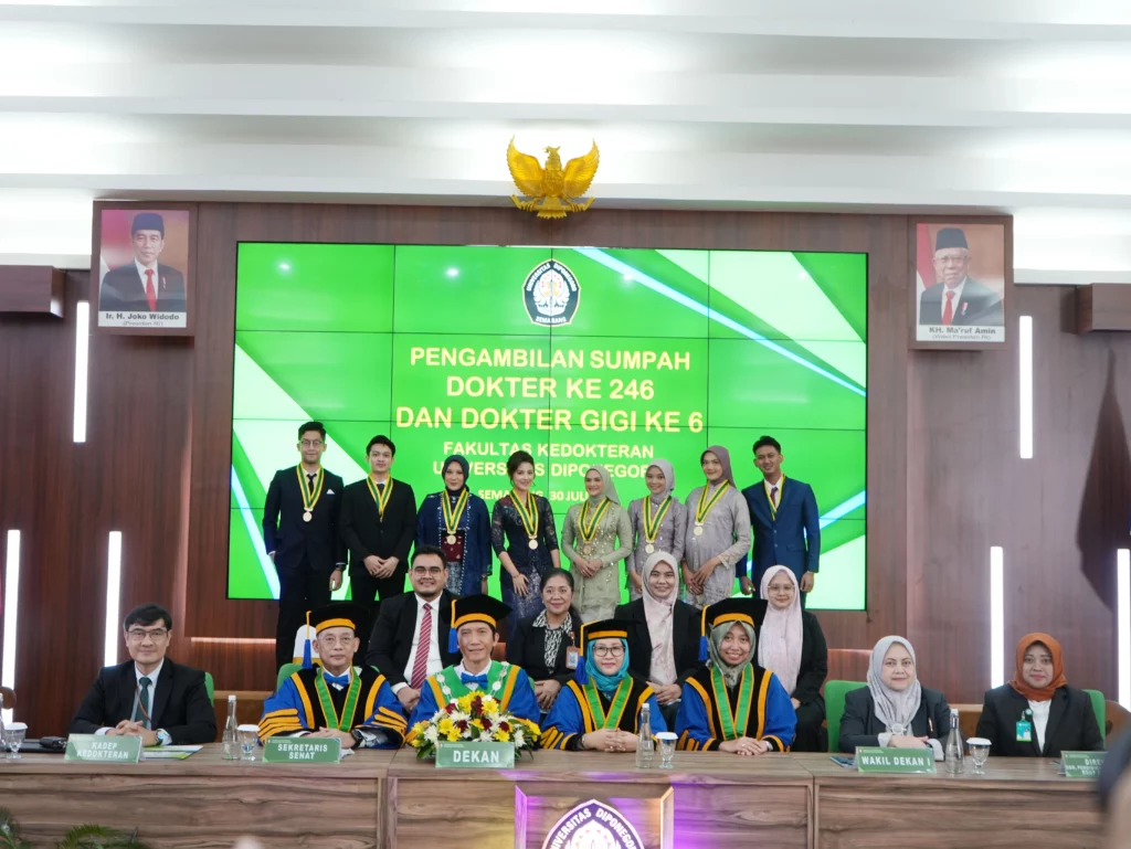 Semarang, 31 Juli 2024 – Fakultas Kedokteran Universitas Diponegoro (FK Undip) kembali mengukir prestasi dengan menyelenggarakan acara sumpah dokter baru ke-246 dan sumpah dokter gigi baru ke-6. Acara ini berlangsung dengan khidmat di Ruang Serbaguna, Gedung A, Kampus FK Undip Tembalang pada Selasa (30/7) dan dipimpin langsung oleh Dekan Fakultas Kedokteran, Dr. dr. Yan Wisnu Prajoko, M.Kes., Sp.B., Subsp.Onk(K).